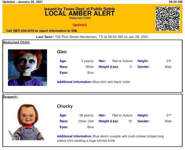The Texas Department of Public Safety issued an Amber Alert at the end of January for the malevolent, murderous, cursed doll Chucky from the Child’s Play movies. It should be noted that, in case you were beginning to get terrified and considering hiding all of your knives, the scary doll doesn’t actually exist and therefore was not missing.