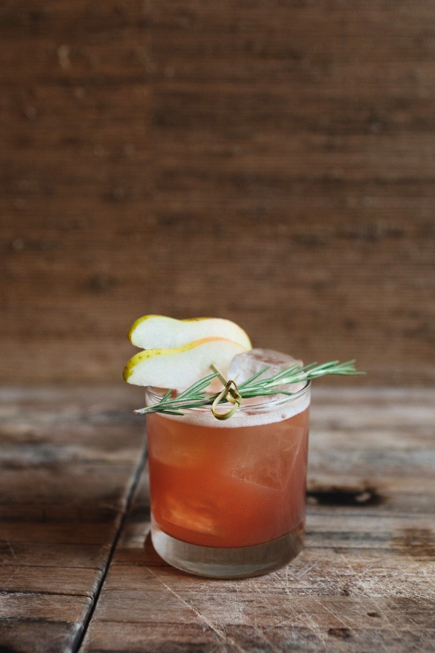 Preparation: Add 3 pear slices and 1 sprig of rosemary to a cocktail shaker and muddle, combine all remaining ingredients in the cocktail shaker with ice. Shake and strain into a chilled rocks glass with ice, and garnish with a sprig of rosemary and 2 pear slices.