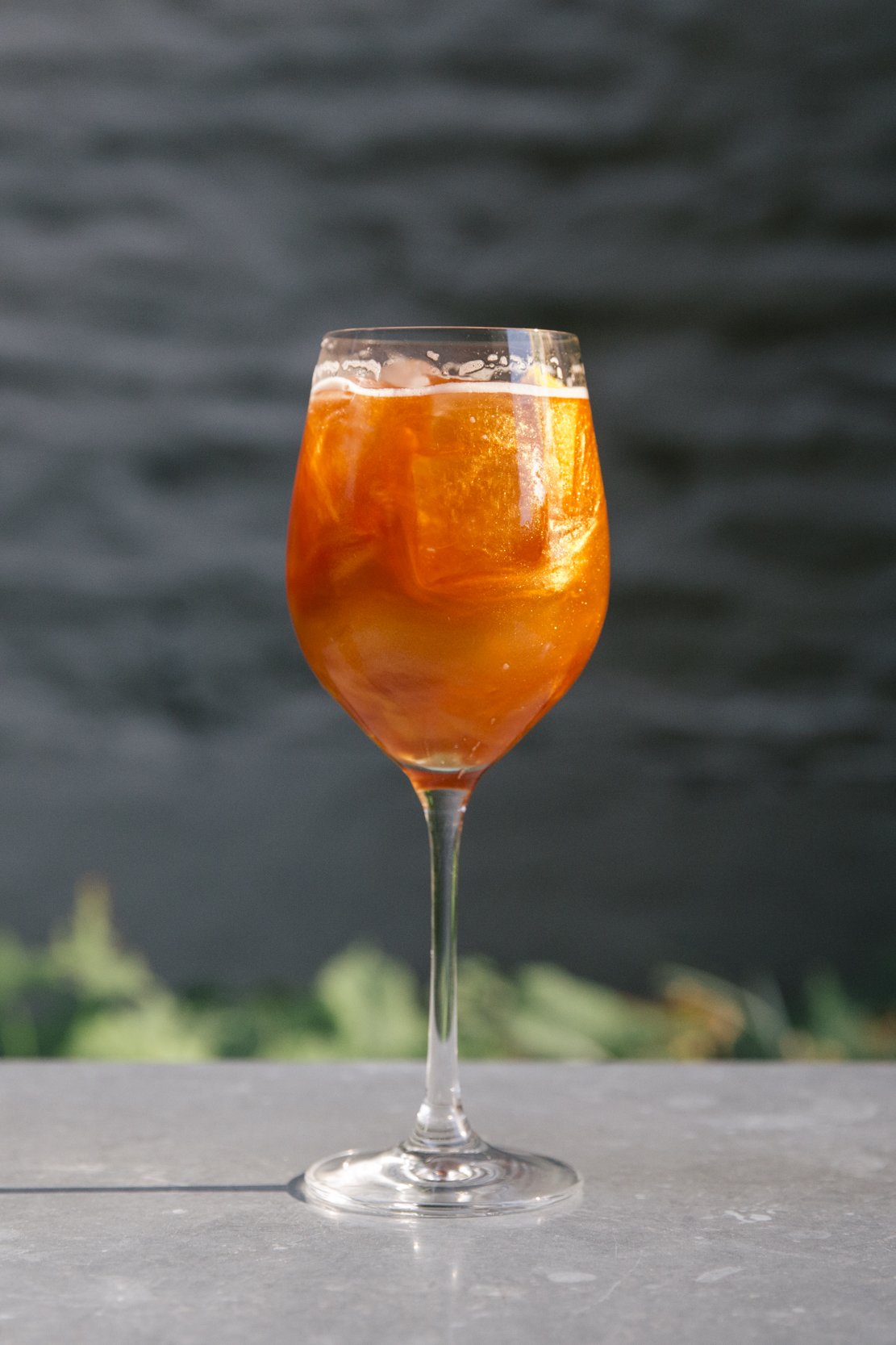 Preparation: Both tall glasses filled with Campari ice cubes, crack both bottles and pour into pre-garnished glasses. Will evolve and change as ice cubes melt.