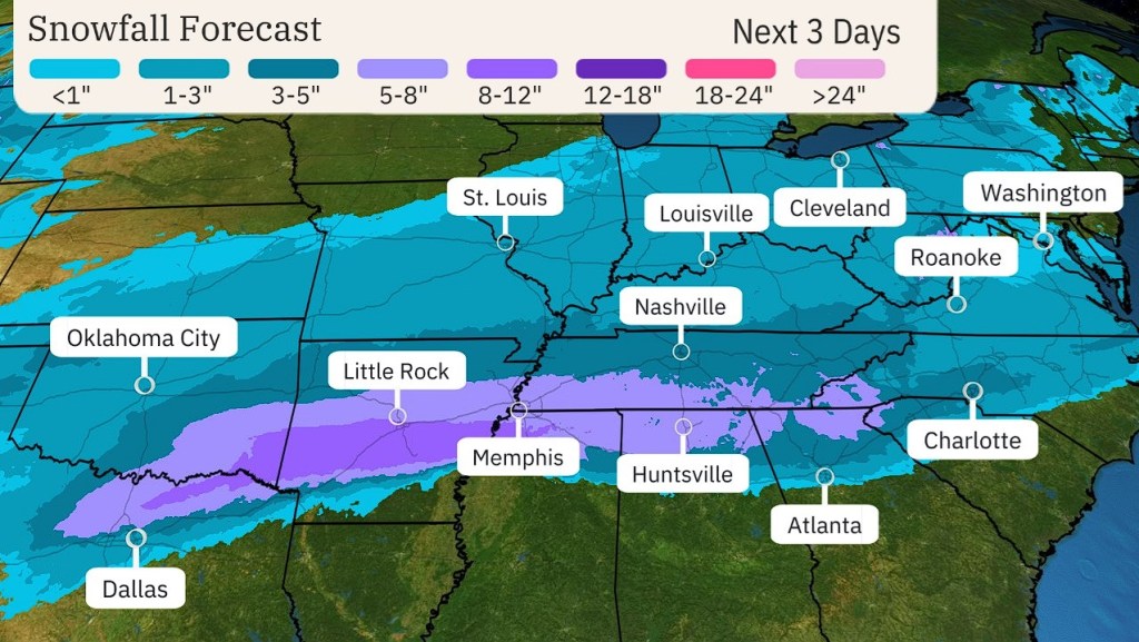 The Weather Channel more or less agrees with these totals, forecasting 5 to 8 inches of snowfall from an area north of Dallas to Huntsville. That said, it projects that between 8 and 12 inches of snow could fall across central Arkansas and other regions in the mid-South.